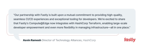 「我們與 Fastly 的合作關係基於一個共同的承諾,即為開發人員提供高品質、無縫的 CI/CD 體驗和卓越的工具,」HashiCorp 技術聯盟總監 Asvin Ramesh 說,「很高興與大家分享一個訊息:Fastly 的 Compute@Edge 現在已與 HashiCorp Terraform 整合,可實現大規模的開發人員賦能和更靈活的基礎設施管理,所有工作都能一站式完成」。