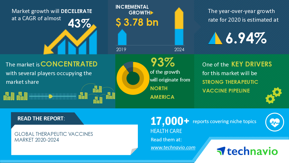 LONDON--(BUSINESS WIRE)--The global therapeutic vaccines market size is expected to grow by USD 3.78 billion as per Technavio. This marks a significant market growth compared to the 2019 growth estimates due to the impact of the COVID-19 pandemic in the first half of 2020. However, the market is expected to decelerate at a CAGR of almost 43% during the forecast period. Request Free Sample Report on COVID-19 Impacts