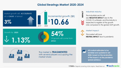 LONDON--(BUSINESS WIRE)--The bearings market is poised to grow by USD 10.66 billion during 2020-2024 progressing at a CAGR of almost 3% during the forecast period.
