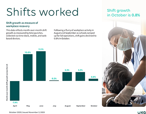 According to the October 2020 Workforce Activity Report from UKG (Ultimate Kronos Group), monthly shift1 growth slowed from 3.3% in both August and September to only 0.8% for the month of October2. | |