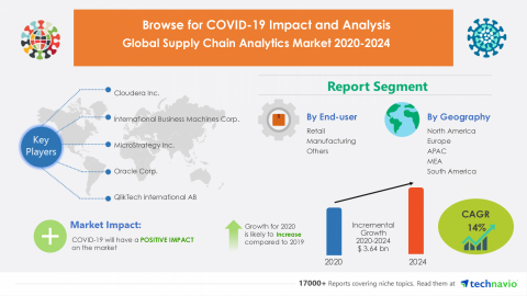LONDON--(BUSINESS WIRE)--The supply chain analytics market is expected to grow by USD 3.64 billion during 2020-2024, according to Technavio. The report offers a detailed analysis of the impact of the COVID-19 pandemic on the supply chain analytics market in optimistic, probable, and pessimistic forecast scenarios.