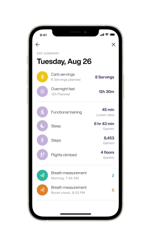 En combinant les données de Garmin et de Lumen, les utilisateurs pourront surveiller leur consommation d'énergie sous forme de glucides via des notifications qui les guideront pour savoir quand respirer dans le dispositif Lumen et profiter de leur journée, ou quand le faire après un entraînement. Les utilisateurs peuvent maintenant constater comment leur entraînement quotidien affecte leur métabolisme par des macros de récupération et un résumé complet de l'entraînement Garmin.