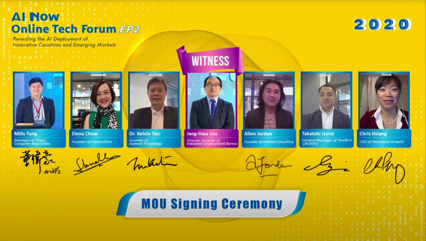 The AI NOW 2020 MOU Signing Ceremony was witnessed by Jang-Hwa Leu (Director-General of Taiwan’s Industrial Development Bureau) and the signatories include Mills Tung (Manager of Taipei Computer Association), Elena Chow (Founder of ConnectOne), Dr. Kelvin Tan (Founder of Eyemail Technology), Allen Jordan (Founder of Goshen Consulting), Takatoki Izumi (General Manager of One&Co (JR East)), and Chris Hsiang (CEO of Panorama Growth). (Photo: Business Wire)