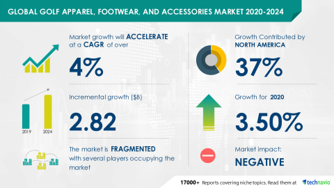 LONDON--(BUSINESS WIRE)--Technavio has been monitoring the golf apparel, footwear, and accessories market and it is poised to grow by USD 2.82 bn during 2020-2024, progressing at a CAGR of over 4% during the forecast period. The report offers an up-to-date analysis regarding the current market scenario, latest trends and drivers, and the overall market environment.