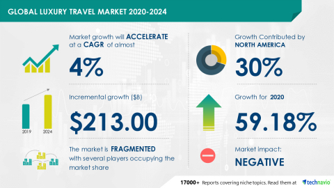 LONDON--(BUSINESS WIRE)--Technavio has been monitoring the luxury travel market and it is poised to grow by USD 213.00 billion during 2020-2024, progressing at a CAGR of almost 4% during the forecast period. The report offers an up-to-date analysis regarding the current market scenario, latest trends and drivers, and the overall market environment.