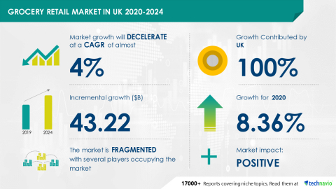 LONDON--(BUSINESS WIRE)--Technavio estimates the grocery retail market in UK to grow by USD 43.22 billion during 2020-2024. However, the growth momentum is expected to decelerate at a CAGR of almost 4% during the forecast period. The report offers an up-to-date analysis regarding the current market scenario, latest trends and drivers, and the overall market environment.
