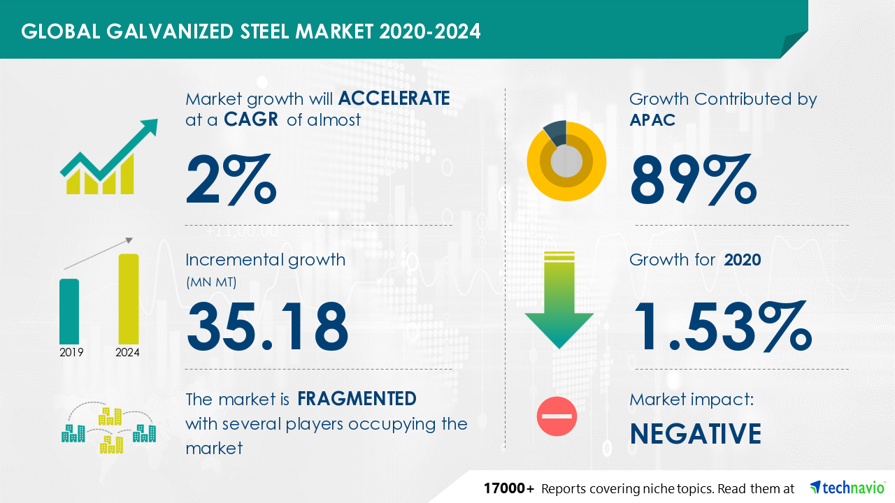 Global Galvanized Steel Market to Grow by 35.18 Million Mt During 2020-2024 | Featuring ArcelorMittal SA, Baosteel Group Corp., and HBIS Group Co. Ltd. Among Others | Technavio