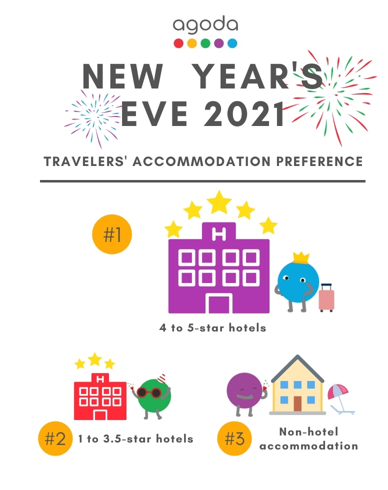 SINGAPORE--(BUSINESS WIRE)--After almost a year of restricted travel, travelers are indulging in more high-end stays this New Year’s Eve. According to booking data from digital travel platform Agoda, 4 to 5-star hotels are the accommodation of choice to ring in 2021 globally and saw an increase of 13 percentage points as compared to 2019, pushing 1 to 3.5-star hotels down to second place this year.