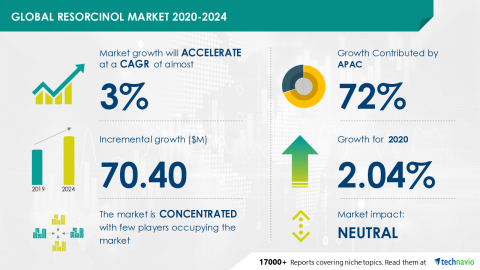 LONDON--(BUSINESS WIRE)--The resorcinol market is expected to grow by USD 70.40 million during 2020-2024, according to Technavio. The report offers a detailed analysis of the impact of the COVID-19 pandemic on the resorcinol market in optimistic, probable, and pessimistic forecast scenarios.