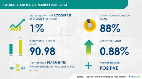 LONDON--(BUSINESS WIRE)--The canola oil market is poised to grow by 90.98 thousand MT during 2020-2024, progressing at a CAGR of about 1% during the forecast period.