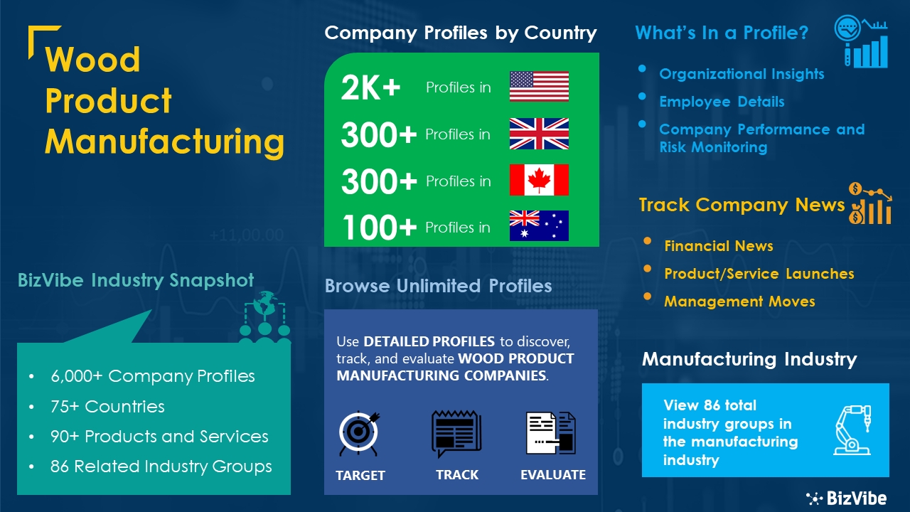 BizVibe’s platform contains 6,000+ wood product manufacturing company profiles which span across 75+ countries: