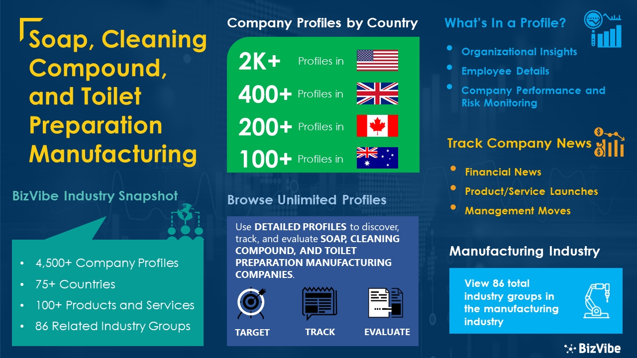 BizVibe’s platform contains 4,500+ soap, cleaning compound, and toilet preparation manufacturing company profiles which span across 75+ countries:
