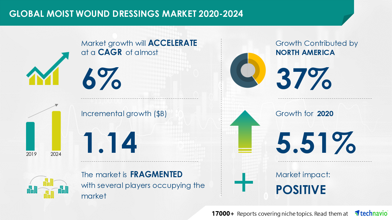 LONDON--(BUSINESS WIRE)--The moist wound dressings market is poised to grow by USD 1.14 billion during 2020-2024, progressing at a CAGR of almost 6% during the forecast period.