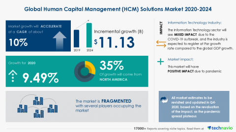 LONDON--(BUSINESS WIRE)--The human capital management (HCM) solutions market is poised to grow by USD 11.13 billion during 2020-2024, progressing at a CAGR of about 10% during the forecast period.