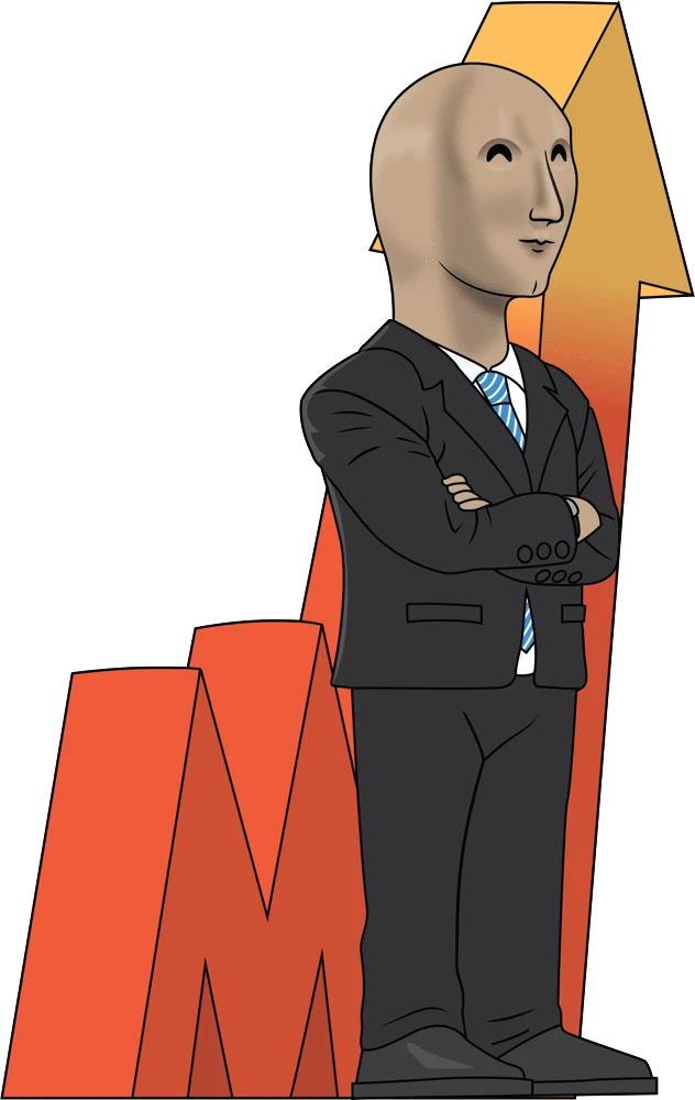 The word "stocks" is misspelled on purpose and combined with Meme Man standing in front of a graph (up and to the right of course) which represents the stock market. Originating in 2017, the image has spread to hundreds of millions of views over the past few years. Stonks only go up.