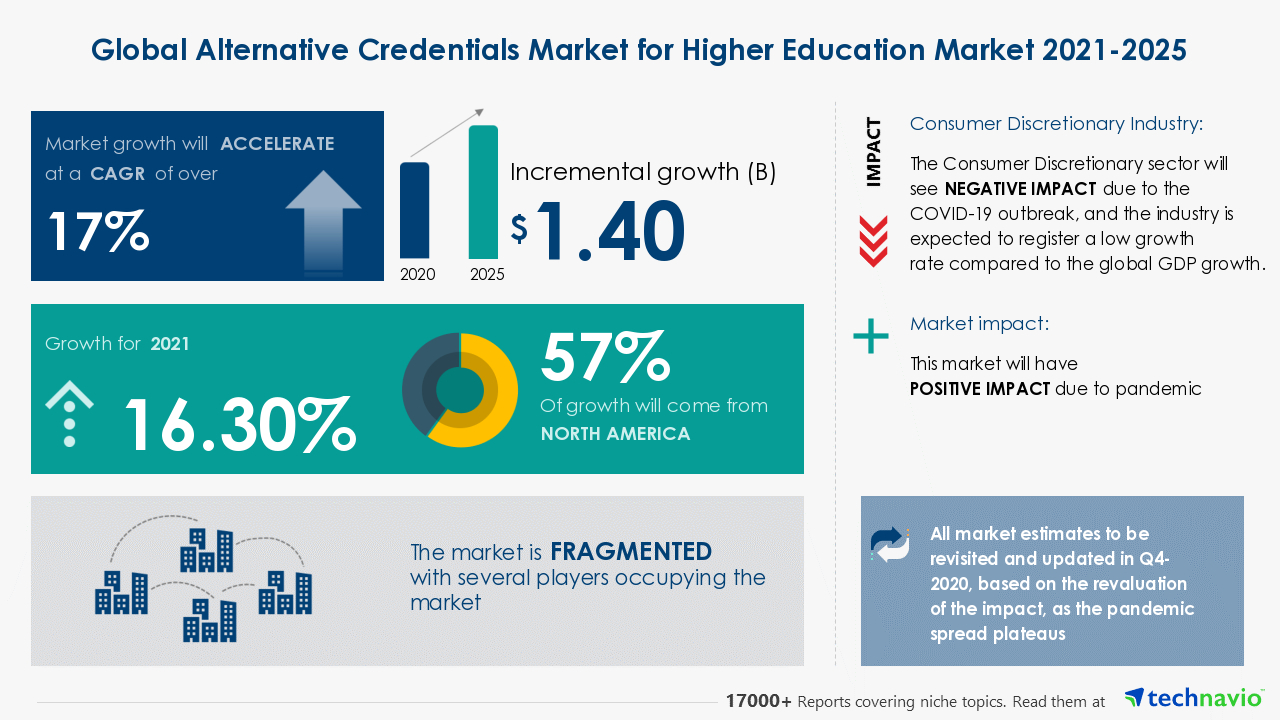 LONDON--(BUSINESS WIRE)--The alternative credentials market for higher education is poised to grow by $ 1.40 bn during 2021-2025 progressing at a CAGR of over 17% during the forecast period.
