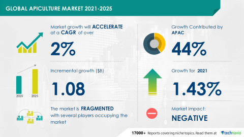 LONDON--(BUSINESS WIRE)--Technvaio forecast the global apiculture market is expected to grow by USD 1.08 billion during 2021-2025 as per Technavio. This marks a significant market slow down compared to the 2019 growth estimates due to the impact of the COVID-19 pandemic in the first half of 2020. However, healthy growth is expected to continue throughout the forecast period, and the market is expected to grow at a CAGR of over 2%.