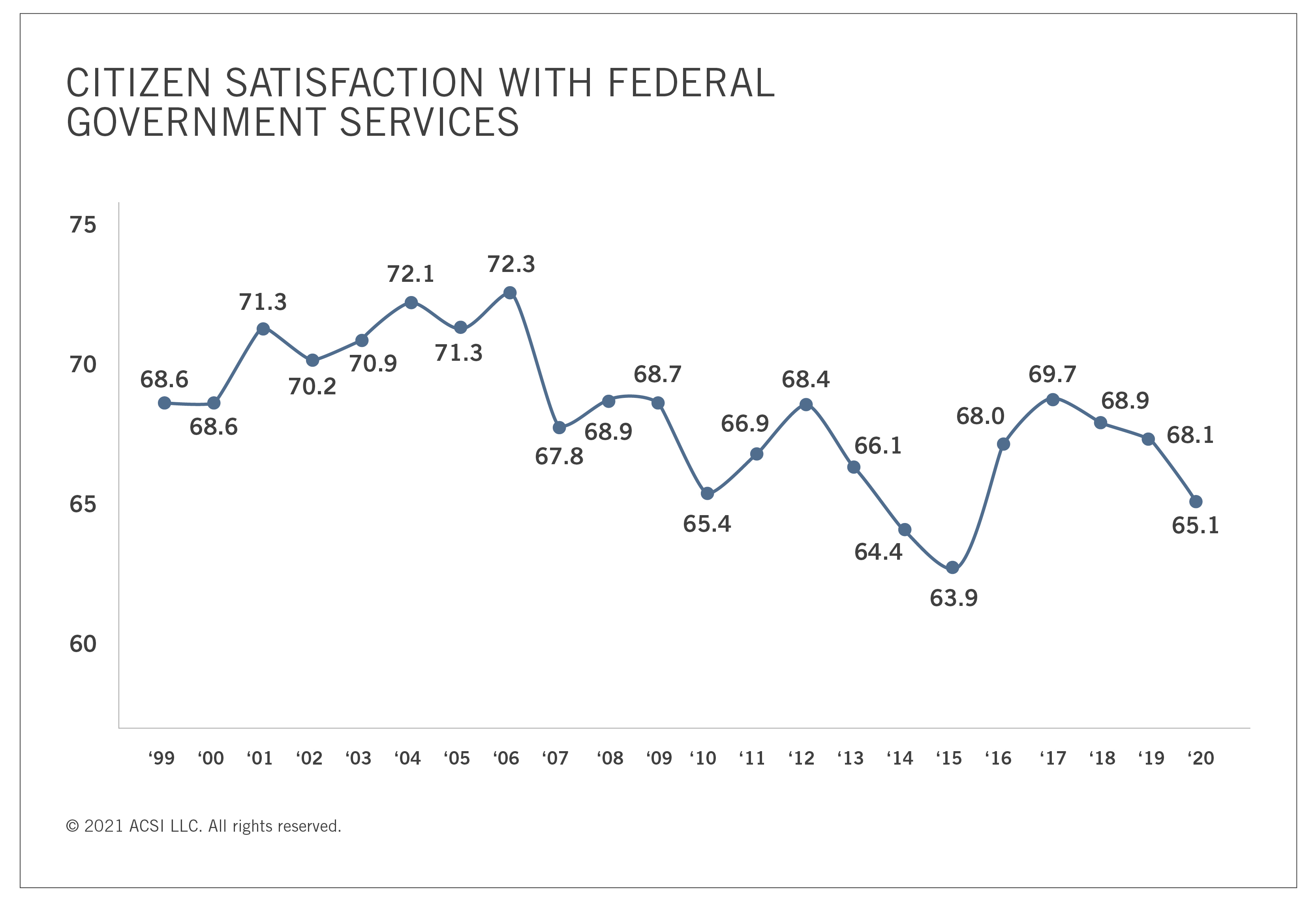 Citizen satisfaction plummets 4.4% to a score of 65.1 (out of 100), according to the American Customer Satisfaction Index’s (ACSI®) Federal Government Report 2020.