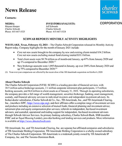 WESTLAKE, Texas--(BUSINESS WIRE)--The Charles Schwab Corporation released its Monthly Activity Report today. Company highlights for the month of January 2021 include: