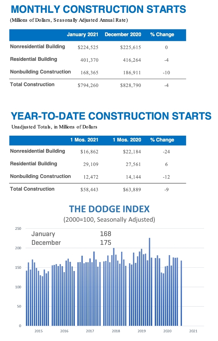 With only one month of 2021 completed, a year-to-date analysis will provide little useful information. Additionally, January 2020 (i.e. pre-pandemic) was the culmination of a strong cyclical upswing in construction starts that began in 2010 and thus provides a poor point of comparison. An alternative viewpoint for analysis is comparing 12-month totals. For the 12 months ending January 2021 total construction starts were 11% below the 12 months ending January 2020. Nonresidential starts were down 25%, while nonbuilding starts dropped 15%. Residential starts, however, were 5% higher for the 12 months ending January 2021. In January, the Dodge Index lost 4% to 168 (2000=100) from the 175 reading in December.