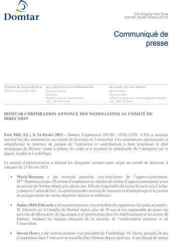 DOMTAR CORPORATION ANNONCE DES NOMINATIONS AU COMITÉ DE DIRECTION