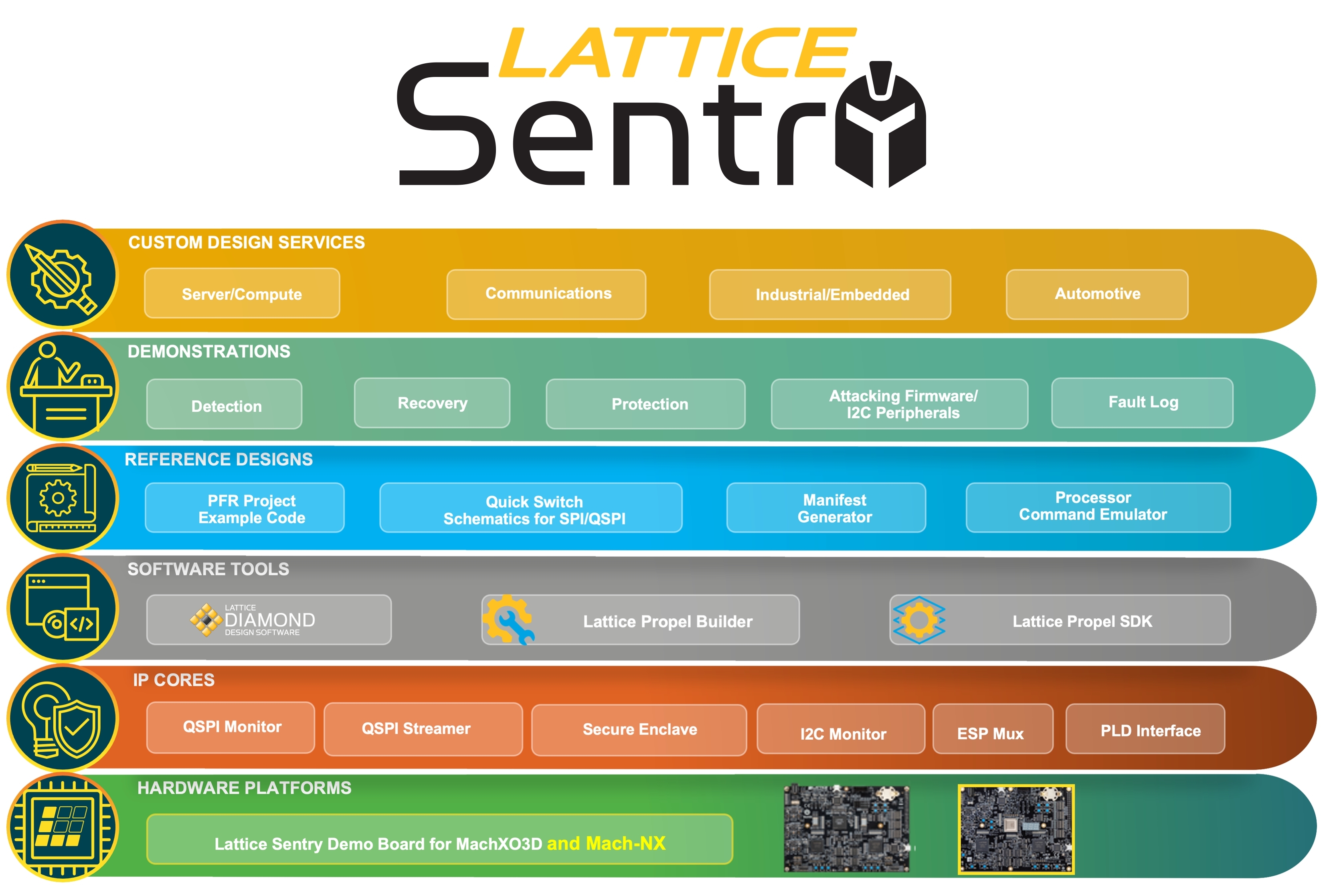 The Lattice Sentry solutions stack helps developers create cyber resilient system control applications compliant with NIST guidelines for platform firmware security (NIST SP-800-193). It consists of a complete reference platform, fully validated IP building blocks, easy-to-use FPGA design tools, reference designs, and a network of custom design services. (Photo: Business Wire)