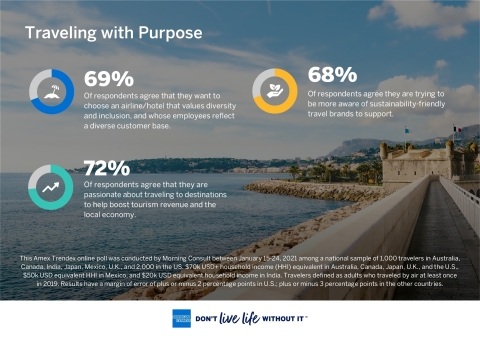 NOVA YORK--(BUSINESS WIRE)--A American Express (NYSE: AXP) publicou hoje o American Express Travel: Global Travel Trends Report, que fornece uma visão exclusiva sobre os sentimentos dos consumidores em relação às viagens quase um ano após o início da pandemia da COVID-19. Os resultados do relatório, baseados em pesquisas em sete países (Estados Unidos, Austrália, Índia, Canadá, México, Japão e Reino Unido1), demonstram que os consumidores estão ansiosos para viajar novamente e já planejam suas futuras viagens.