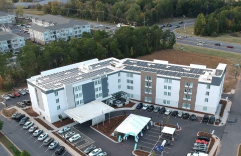 Powering up at the SpringHill Suites Charlotte-Southwest is good for the planet: the 310 solar panels on its roof harness the sun’s energy to produce electricity, heat water and reduce the hotel’s carbon footprint. The environmentally-friendly hotel saves roughly $20,000 per year in electric costs.