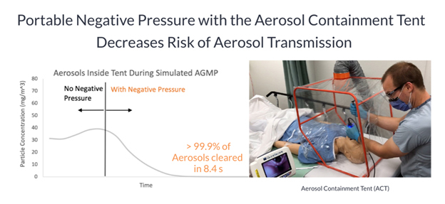The COVID-19 virus, SARS-CoV-2, is spread through aerosols and respiratory droplets. Common medical airway procedures, like intubation, extubation, BiPAP and CPAP, generate aerosols and are known as Aerosol-Generating Medical Procedures (AGMPs). Research demonstrates healthcare workers performing AGMPs wearing PPE alone are two times more likely to be hospitalized with COVID-19 compared to healthcare workers not performing AGMPs (El-Baghdadly et al. Anaesthesia 2020). The ACT creates a negative pressure zone around a patient’s head and shoulders which removes >99.9% of aerosols in less than nine seconds, allowing AGMPs to be performed safely.