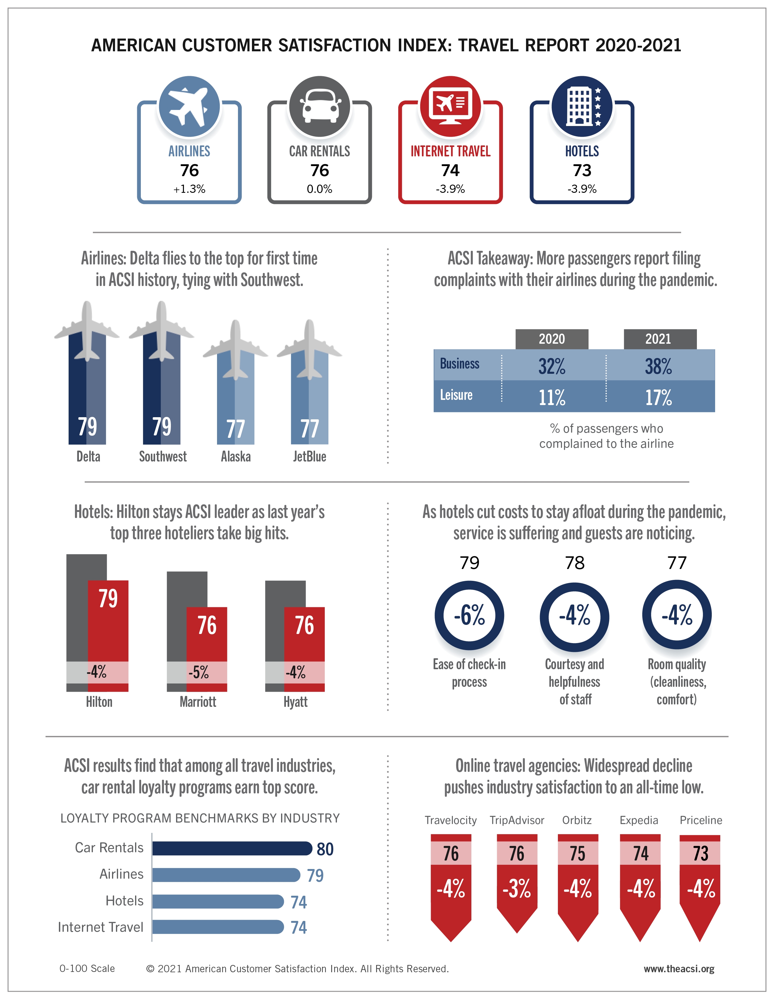 According to the American Customer Satisfaction Index (ACSI®) Travel Report 2020-2021, only airlines keep customer satisfaction moving in a positive direction. The car rental industry holds steady, yet guest satisfaction for hotels heads south, as almost every major chain experiences ACSI losses. Satisfaction with online travel agencies sinks to an all-time low.