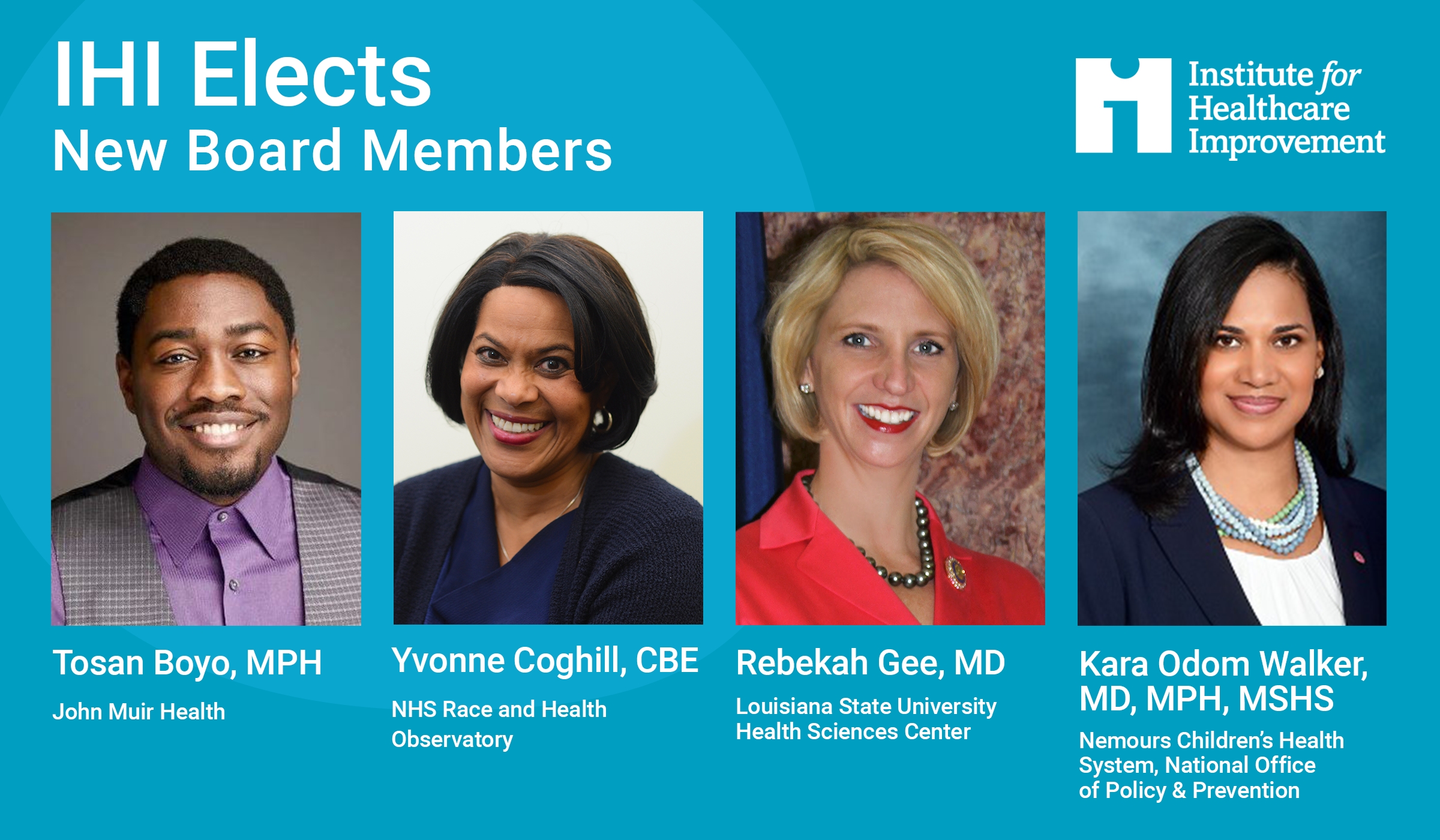 BOSTON--(BUSINESS WIRE)--The Institute for Healthcare Improvement (IHI) has added four new members to its Board of Directors. The appointees have a wealth of experience related to current IHI priorities, including advancing equity and confronting institutional racism, improving population health, and closing gaps in the delivery of safe, equitable, and respectful maternal and infant care.