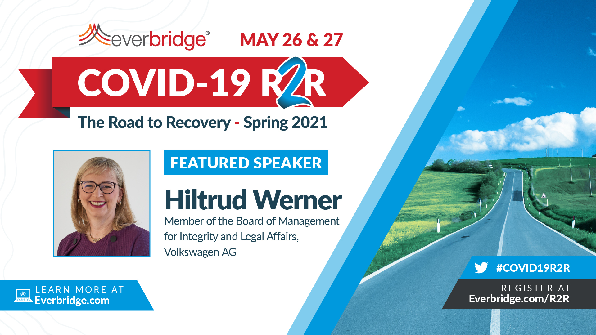 BURLINGTON, Mass.--(BUSINESS WIRE)--Everbridge, Inc. (NASDAQ: EVBG), líder mundial en gestión de eventos críticos (CEM), ha anunciado que Hiltrud Werner, miembro del Consejo de Administración del Grupo Volkswagen para la integridad y los asuntos legales, intervendrá hoy en su congreso virtual edición de primavera de 2021 de COVID-19: Road to Recovery (R2R), que tendrá lugar los días 26 y 27 de mayo, y en el que se debatirá sobre el cumplimiento y la gestión de riesgos en un mundo pospandémico.