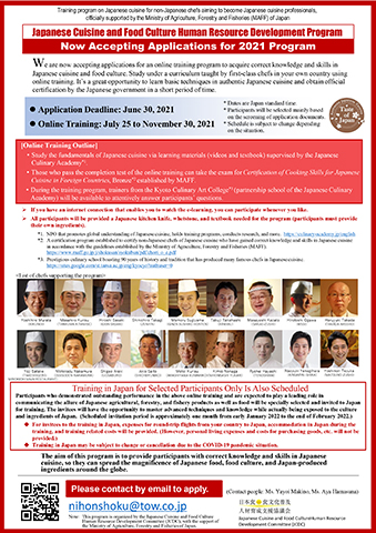 东京--(BUSINESS WIRE)--(美国商业资讯)--一项日本料理培训计划现接受报名申请,该计划针对那些认真研习日本料理的非日籍厨师,由日本农林水产省(MAFF)提供官方支持。 我们现接受线上培训计划的报名申请,参加者可学习有关日本料理和美食文化的真正知识和技能。在您本国即可学习到一流厨师教授的课程。这是在短时间内学习正宗日本料理技巧和获得日本政府官方证书的绝好机会。 申请截止日期:2020年10月30日 电子学习课程:2020年10月19日-11月30日 实时线上课程(仅限部分学员):2020年12月1日-2021年2月28日 (日期为日本标准时间) 学员可免费收看由日本料理学院(Japanese Culinary Academy)*2监管的顶级厨师*1的视频!通过视频和教材学习日本料理的基础知识。 在计划期间,来自著名京都调理师专门学校(Kyoto Culinary Art College)*3(日本料理学院的合作学校)的导师将仔细解答学员的问题。 完成电子学习课程的学员可参加由MAFF制定的日本料理烹饪技能国际认证(铜牌)证书*4考试。 只要能够连接互联网收看线上培训视...