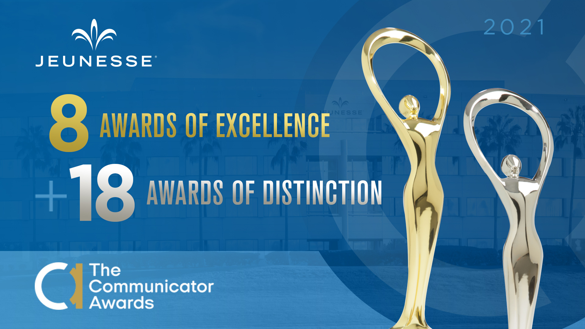 LAKE MARY, Fla.--(BUSINESS WIRE)--Global direct selling company Jeunesse® was honored with 26 awards in the 2021 Communicator Awards competition, receiving eight Awards of Excellence and 18 Awards of Distinction for a variety of communications projects including print, packaging, video, writing and digital communications.