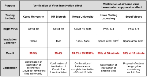 Em um experimento de desinfecção conduzido por uma equipe de pesquisa da Universidade da Coreia no ano passado, a Seoul Viosys confirmou que a tecnologia Violeds desinfeta 99,9% do vírus da COVID-19 em 30 segundos. Além disso, no experimento de desinfecção do ar do Laboratório de Testes da Coreia (KTL), o resultado da pesquisa mostrou que a tecnologia Violeds desinfeta 99% de um espaço de 60㎥ em 30 minutos.