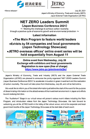东京--(BUSINESS WIRE)--(美国商业资讯)-- (美国商业资讯)--日本经济产业省(METI)和日本贸易振兴机构(JETRO)欣然宣布,双方将联合举办“净零领导人峰会(2021年日本商业会议)”,以加快绿色投资创新和实现碳中和目标。会议将于7月28日(周三)起在线举行。