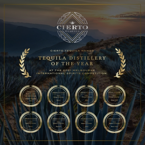 LOS ANGELES--(BUSINESS WIRE)--The Elevated Spirits Company is pleased to announce that Cierto Tequila was named the “Tequila Distillery of the Year” at the 2021 Melbourne International Spirits Competition (MISC). The MISC also honored Cierto with two Gold medals, three Silver medals and two Bronze medals – far surpassing all other tequila brands. With these eight new medals and awards, Cierto Tequila has now won three hundred and fifty-five (355) international medals, awards, and accolades. Cierto Tequila is an authentic, 100% natural “true” tequila made exclusively from healthy, mature Highland agave in Jalisco, Mexico. Due to its character, complexity and incredibly smooth taste, tequila experts around the globe have called Cierto the “World’s Finest Tequila.”