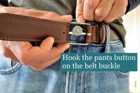 Why doesn't Arkbelt shift? The principle lies in the special characteristic belt buckle. By hooking the pants button on the U-shaped part at the center of the belt buckle, your pants and the belt become fixed.
