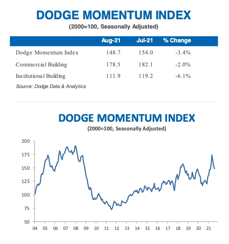 HAMILTON, N.J.--(BUSINESS WIRE)--The Dodge Momentum Index dropped 3% in August to 148.7 (2000=100) from the revised July reading of 154.0. The Momentum Index, issued by Dodge Data & Analytics, is a monthly measure of the first (or initial) report for nonresidential building projects in planning, which have been shown to lead construction spending for nonresidential buildings by a full year.
