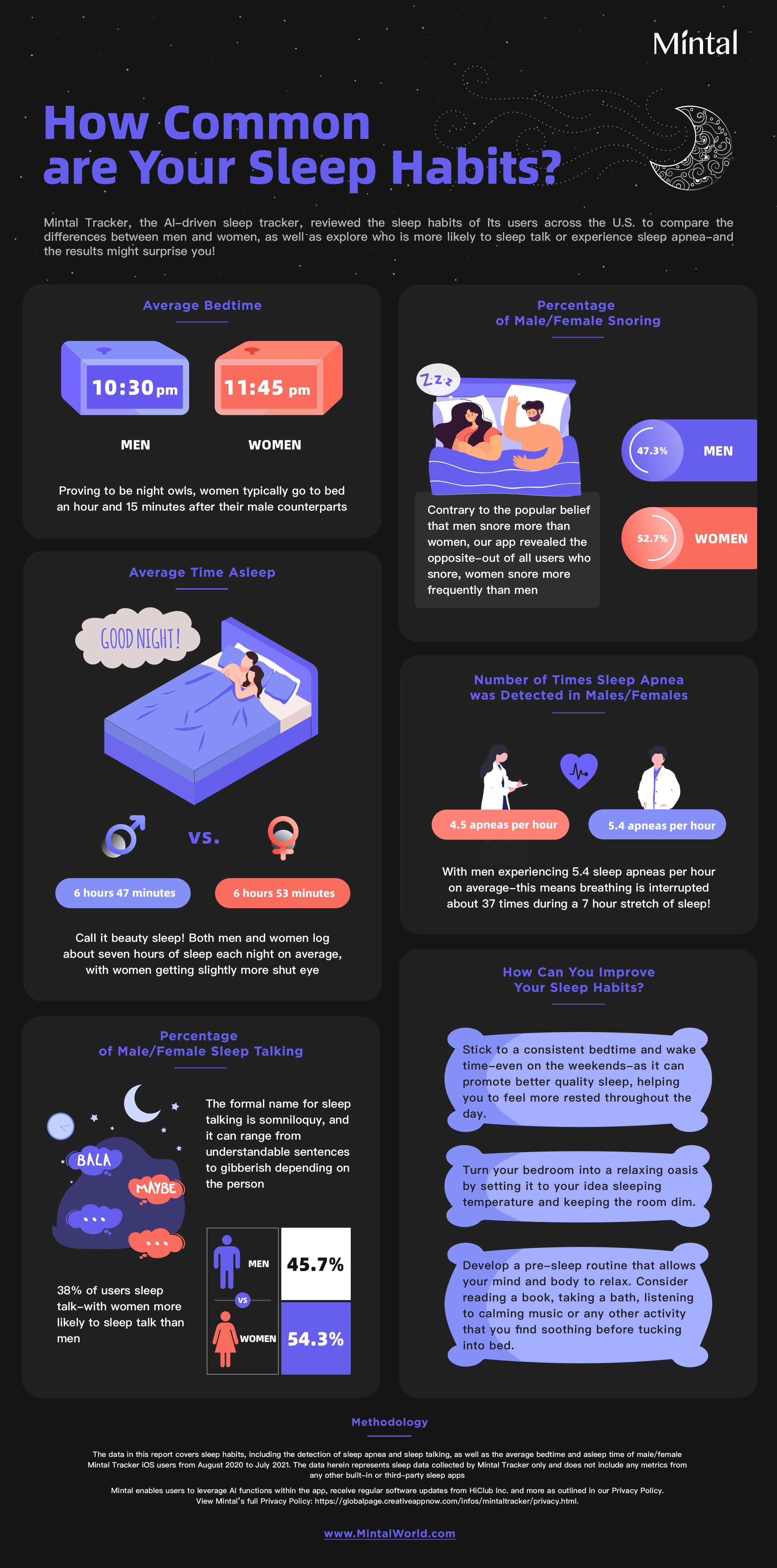 The data in the report covers the sleep habits of Mintal Tracker’s iOS and Android users between August 2020 and July 2021 in the U.S. The Mintal Tracker app enables users to gain a deeper understanding of their sleep patterns and habits, as well as leverages AI to alert users about their propensity to snore, sleep talk, experience sleep apnea and more.