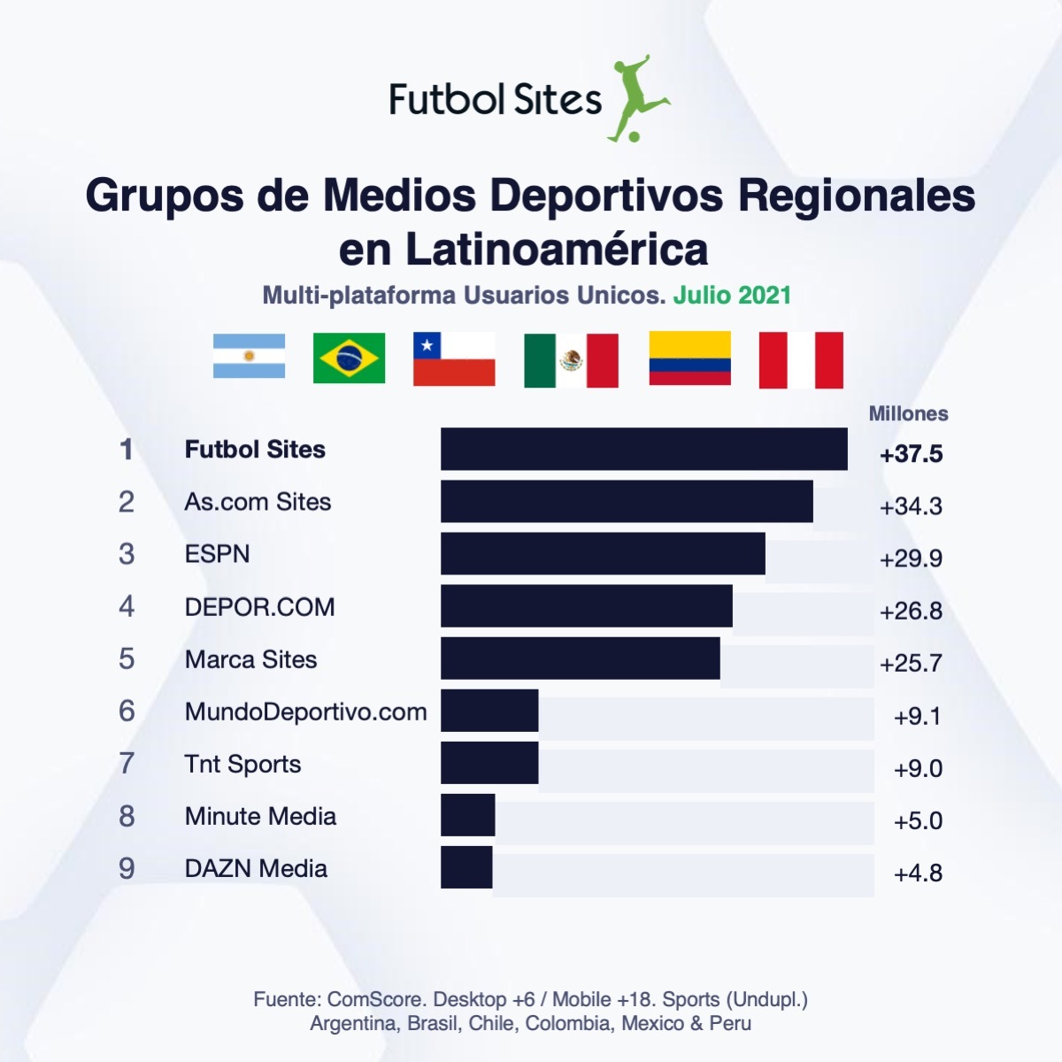 Según los rankings de julio relevados por Comscore, Futbol Sites es el grupo de medios deportivos número uno en la región, tanto por usuarios únicos como por sesiones.