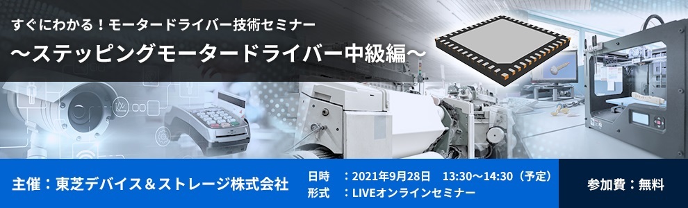 (ビジネスワイヤ) -- 東芝デバイス&ストレージ株式会社は、来る9月28日(火)に、「すぐにわかる!モータードライバー技術セミナー~ステッピングモータードライバー中級編~」と題し、無料Webセミナー(ウェビナー)を開催いたします。