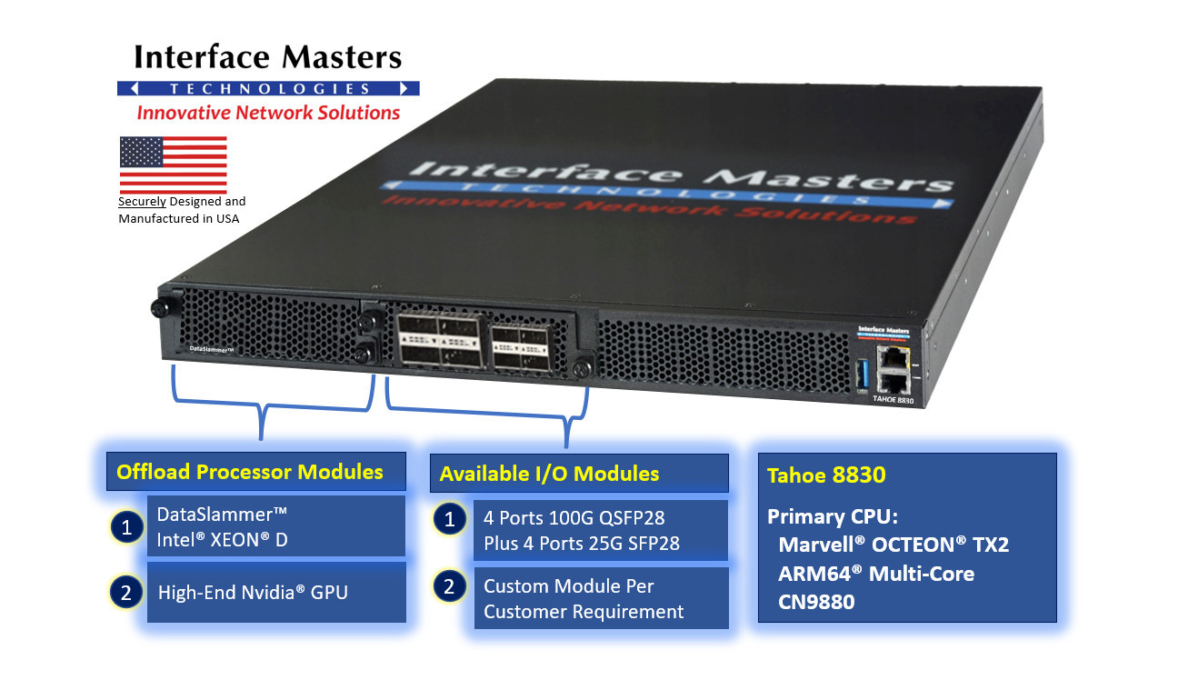 SAN JOSE, Calif.--(BUSINESS WIRE)--Interface Masters Technologies announces Tahoe 8830, an off-the-shelf artificial intelligence and machine learning workhorse which ‘rounds out’ Interface Masters family of ARM® and MIPs based network appliances. Interface Masters now offers seven unique Marvell® OCTEON® and OCTEON® TX2 based appliances ranging from entry-level single core edge networking appliances up to advanced 48-core artificial intelligence focused appliances.