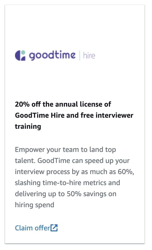 GoodTime’s interview scheduling platform will be offered at a 20% discount. Inclusion in the Activate Console Exclusive Offers program recognizes GoodTime Hire as a solution that is important to the growth of the startups building and scaling their companies on AWS. The offer is available to startups around the globe in English speaking countries.