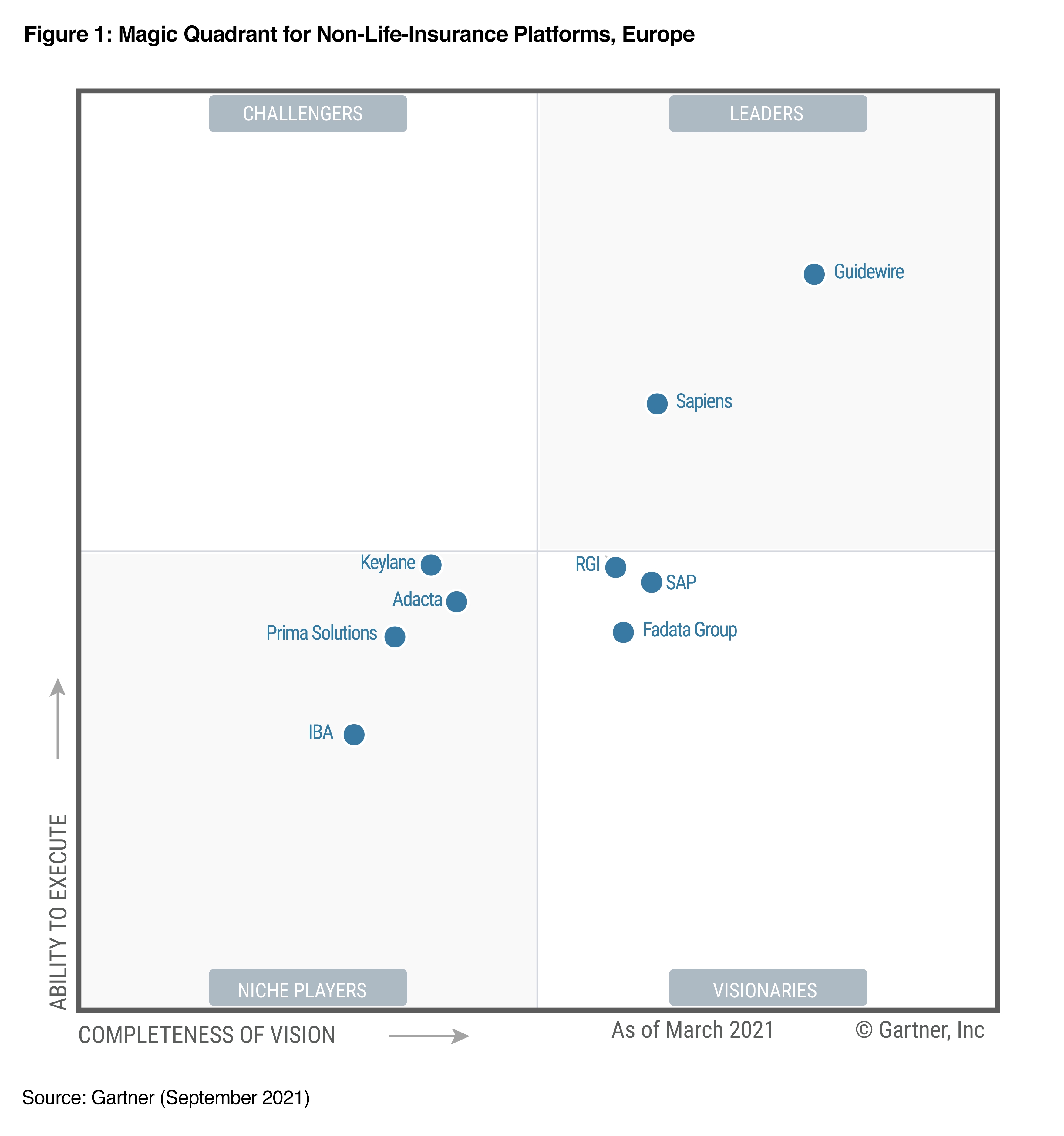 Guidewire Software voor het vierde opeenvolgende jaar erkend als leider in het Gartner® Magic Quadrant™ voor Non-Life Insurance Platforms 2021, Europa