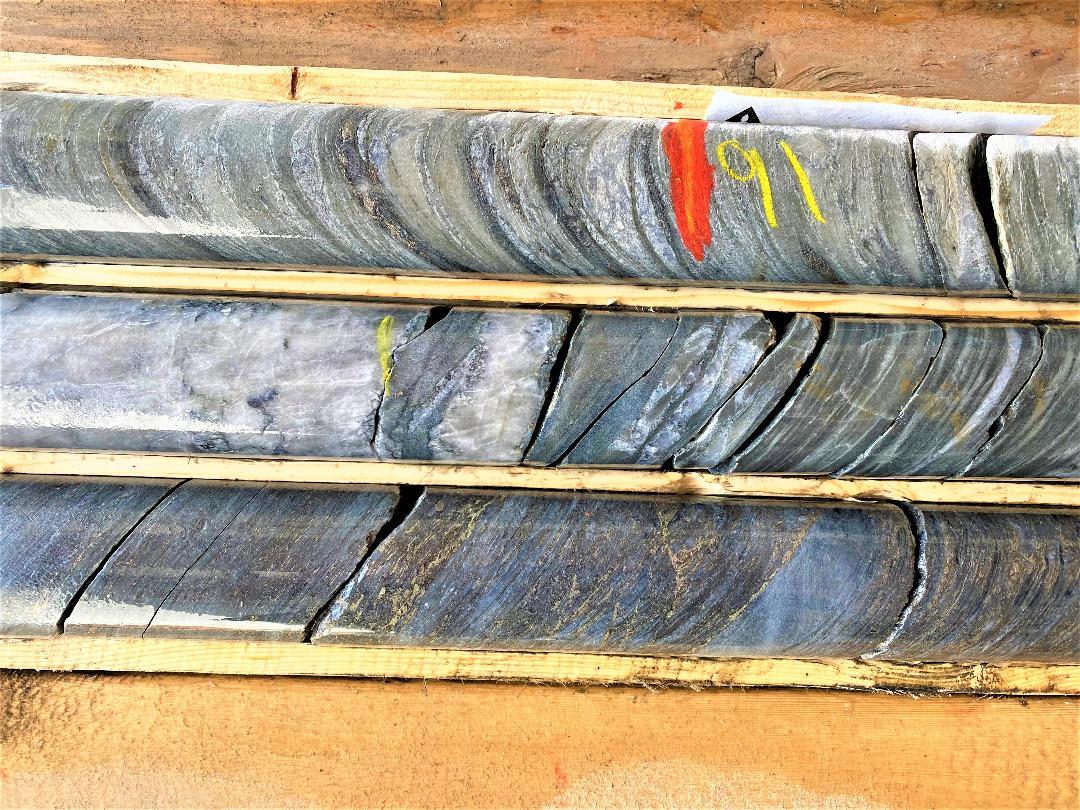The Holes were completed around the Toussaint showing on the Property. Holes HMW 21-01, 21-02, 21-05 and 21-06 were drilled on the western side of the Toussaint. Hole HMW 21-09 was drilled on the eastern side of the Toussaint. All the Holes intercepted Toussaint mineralization (the “Mineralization”). This Mineralization is generally a beige to pale grey coloured volcanic tuff which has been foliated, sheared and strongly altered. Alteration is dominated by silica, sericite and calcite. Ankerite and chlorite alteration are present to a lesser degree. The Mineralization often displays a striped appearance due to abundant parallel laminations. Mineralization is present as pyrite, chalcopyrite and locally as visible gold. Quartz veins as well as veinlets of sulphide minerals are parallel or sub parallel to the foliation.