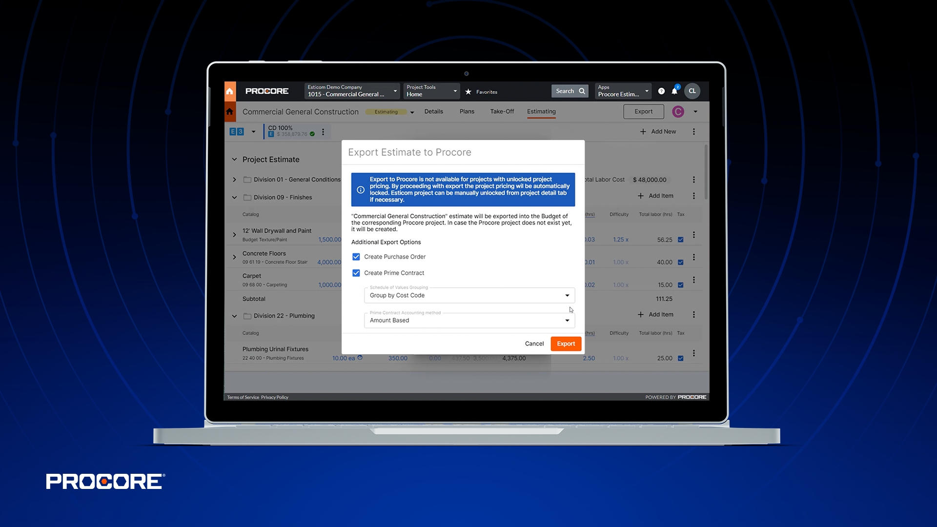 Procore a fait l’acquisition d’Esticom en 2020. L’estimation des coûts de projet est un flux de travail essentiel, et la fonctionnalité d’Esticom est maintenant pleinement intégrée à la plateforme Procore grâce au produit d’estimation de Procore. Ce produit fournit des outils pour l’avant-métré numérique, la production d’estimations et la création d’appels d’offres, et est relié par des flux de travaux au processus de budget de projet, de gestion des modifications et de bon de commande.