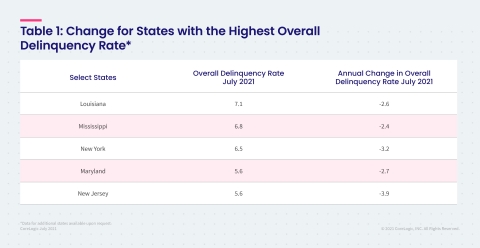 - In July, all U.S. states logged a decrease in annual overall delinquency rates, with New Jersey (down 3.9 percentage points), Florida (down 3.5 percentage points) and Nevada (down 3.3 percentage points) leading with the largest declines.
