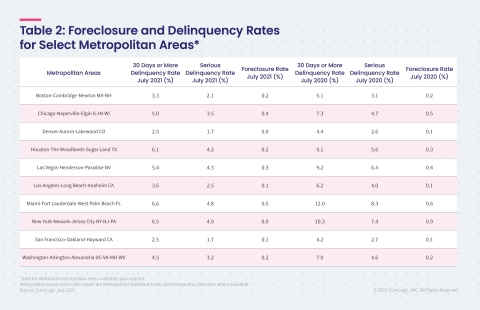 The data in The CoreLogic LPI report represents foreclosure and delinquency activity reported through July 2021. The data in this report accounts for only first liens against a property and does not include secondary liens. The delinquency, transition and foreclosure rates are measured only against homes that have an outstanding mortgage. Homes without mortgage liens are not subject to foreclosure and are, therefore, excluded from the analysis. CoreLogic has approximately 75% coverage of U.S. foreclosure data.