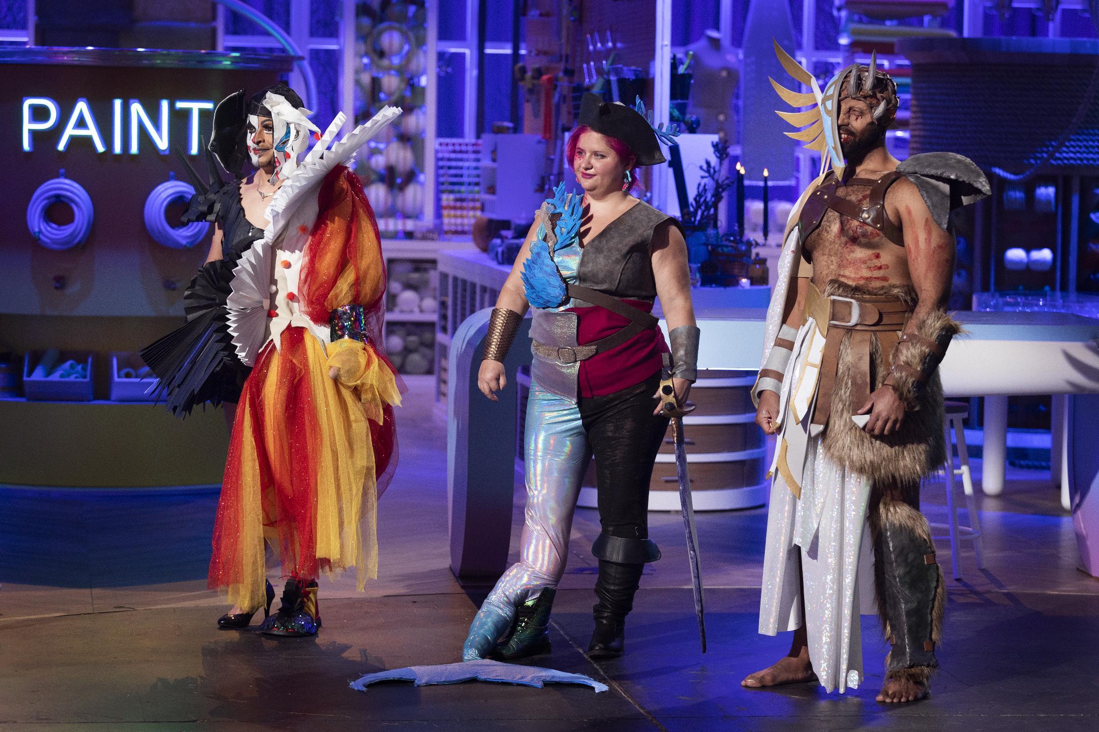 Edgar Eiotown (left, in his winning project costume), visual display coordinator for AHF's Out of the Closet thrift store chain for the last two decades, won first place on HBO Max's "Craftopia" program, Season 2, Episode 2 (the "Bow-Wow Ween" episode) beating out two other talented designers (on right) for the title. (Photo: Business Wire)